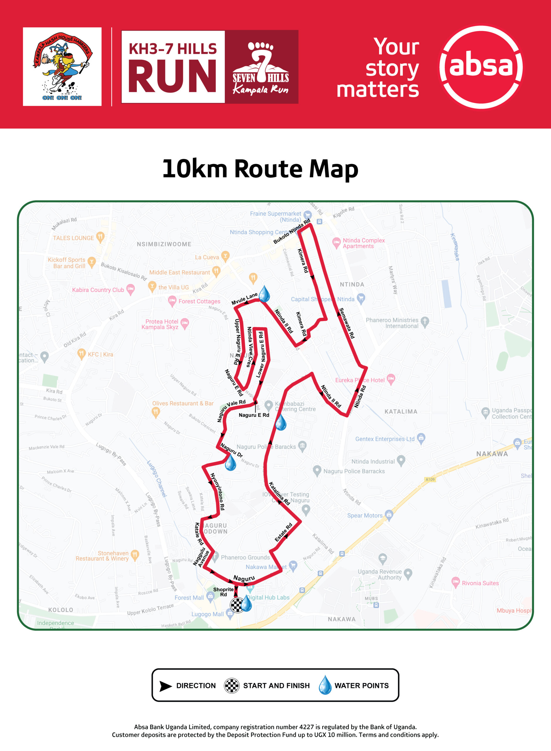 The 10km route traverses Naguru Estate Road, Katalima Road, Ntinda II Road, and Ntinda Road, connecting to Semawata Road, Bukoto-Ntinda Road, Kimera Road, and back to Ntinda II Road, then via Mvule Lane. The course continues through Upper Naguru Road, Ntinda View Crescent, Lower Naguru Road, Naguru Estate Road, Naguru Vale Road, Naguru Drive Road, and Katale Road, eventually linking to Naggulu Avenue, Shoprite Road, and returning to the finishingline.
