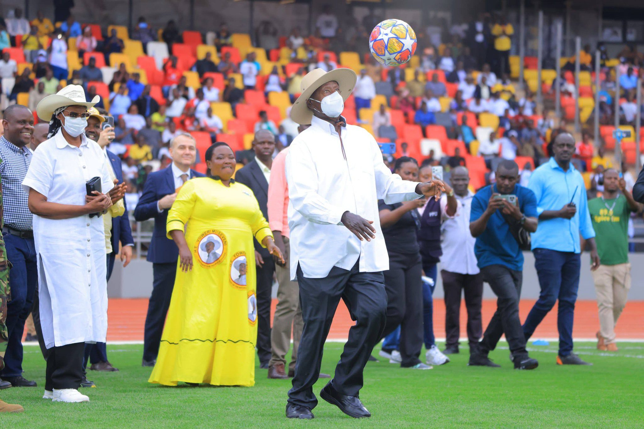 After delivering his speech, President Museveni walked to the football stadium and kicked the first ball accompanied the first lady Janet Kataaha Museveni during the flag off of the Bunyoro Kitara FC and KCCA match.