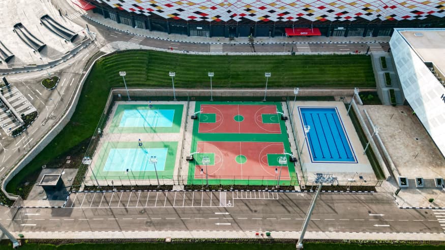 The giant sports facility has a swimming arena, media workstation, food courts, bars, presidential suite, parking plus other spectacular facilities.